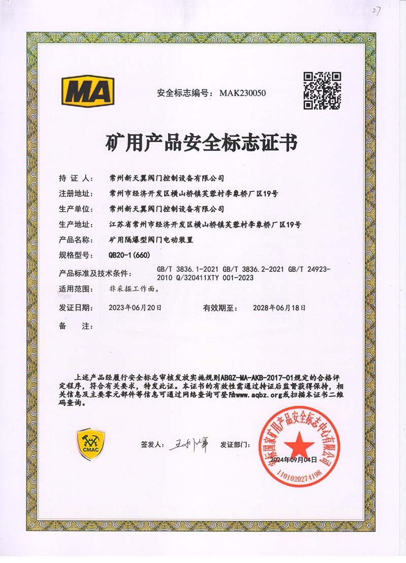 礦用產品安全標志證書QB20-1(380)